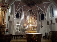 Ein Diptychon - zwei Variationen zu einem Thema. Das rechte ist uns aus der Weihnachts-geschichte bestens vertraut: Maria mit dem neugeborenen Jesuskind im Bethlehemstall, gewärmt vom Atem des Ochsen und eingerahmt von Joseph und den staunend anbetenden Hirten. Oben erscheint als Vorahnung eine Sequenz aus dem Kreuzweg Christi.