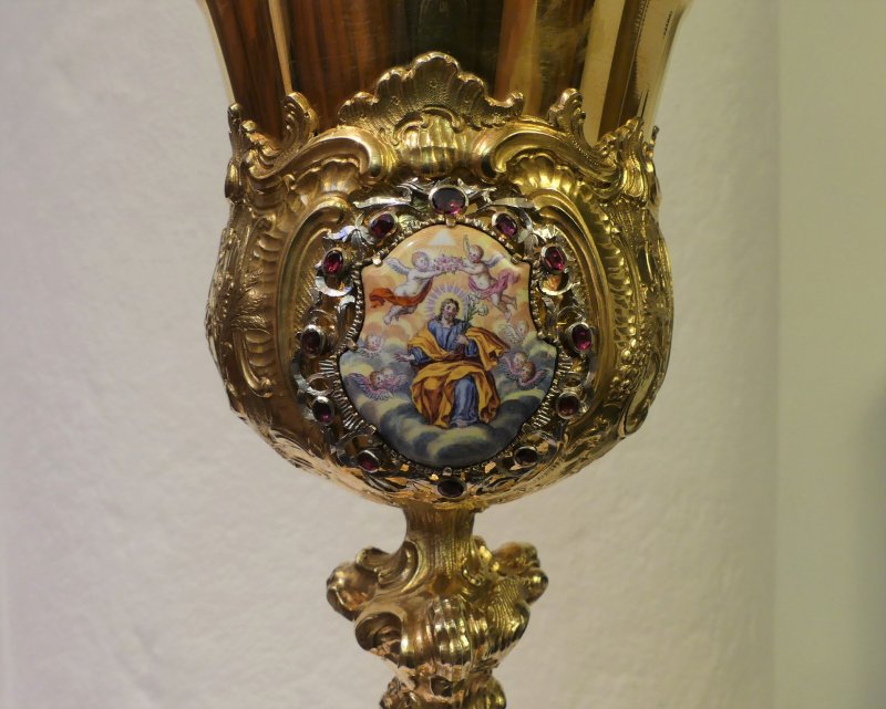 Für das Team der Pfarreieninventarisation ist eine Kollegin in der Pfarr- und Stiftskirche St. Jakob in Straubing tätig. Bei der Erfassung des Kirchenschatzes ist ihr dieser prachtvolle Rokokokelch mit Emailmedaillons ins Auge gestochen. Auf Fuß und Cuppa sind zwischen getriebenen Rocaillen, Weintrauben und Kornähren jeweils drei kartuschenförmige Medaillons mit leuchtend farbigen Emailmalereien angebracht, die – eher selten zu finden – die Figur des hl. Joseph ins Zentrum rücken.