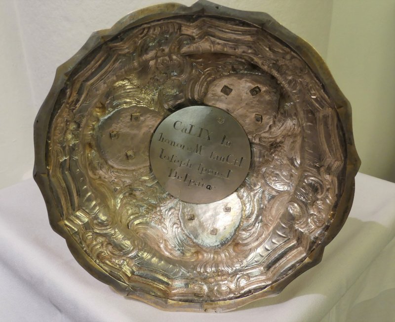 Eine Platte mit Chronogramm und punzierten Marken in der Fußunterseite verrät viel über die Herkunft des Kelches. Die Übersetzung aus dem Lateinischen lautet: Kelch zur Ehre des hl. Joseph, des Bräutigams der Gottesgebärerin. Die römischen Ziffern ergeben addiert die Jahreszahl 1766. Durch das Motiv der Zirbelnuss kann der untere Stempel als das Beschauzeichen der Stadt Augsburg, den Pyr, identifiziert werden. Der Jahresbuchstabe R verweist auf die Jahre 1765 bis 1767. Die Meistermarke am oberen Rand mit den Initialen ICB im Schild stammt von dem Goldschmied Ignatius Caspar Bertholt. Neben der Platte ist der zickzackförmige Tremolierstich (von italienisch „tremolo“ für Zittern) erkennbar. Um den Feingehalt des Silbers zu prüfen, hob der Beschaumeister mit einem flachen Spatel „wackelnd“ einen Span von der Oberfläche ab.